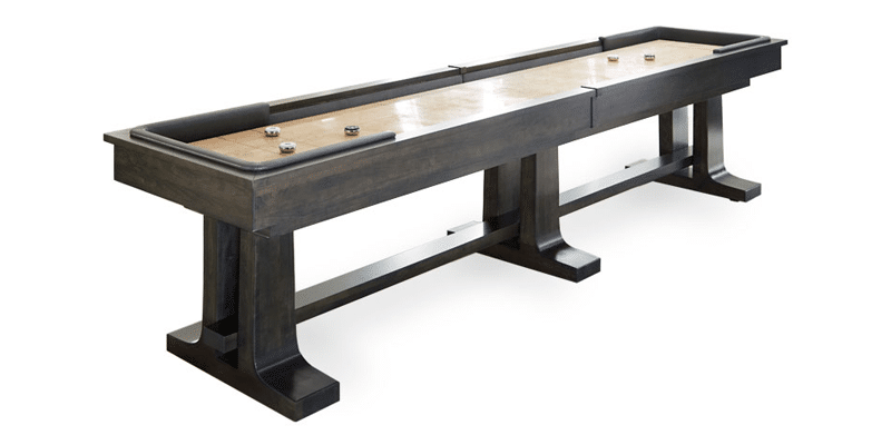 The Atherton Shuffleboard Table is one of the finest shuffleboard tables made today, with an original design that combines modern lines and a traditional silhouette to compliment virtually any room. Available in 9′, 12′, 14′, 16′, and 18′ sizes to fit your room. The Atherton Shuffleboard Table is an original California House design that combines a traditional silhouette with modern lines. Solid 2.25″ thick solid tongue & grooved beech wood play field with inlaid black walnut scoring areas. Pictured in Distressed & Glazed Carmel finish.