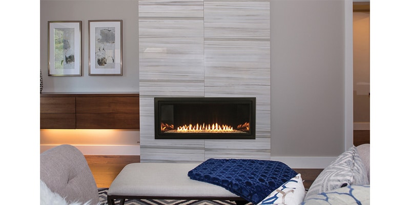 With its strong horizontal lines, contemporary burner, and chic accessories, a Boulevard Linear Vent-Free Fireplace adds