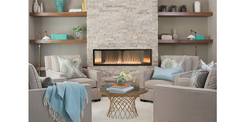 With its strong horizontal lines, contemporary burner, and chic accessories, a Boulevard Linear Vent-Free Fireplace adds